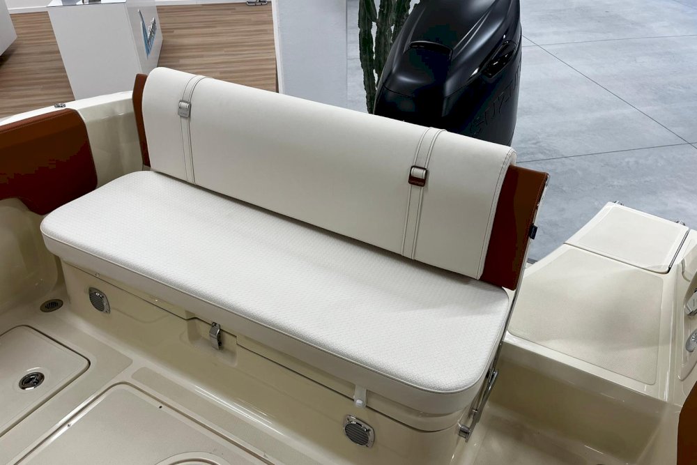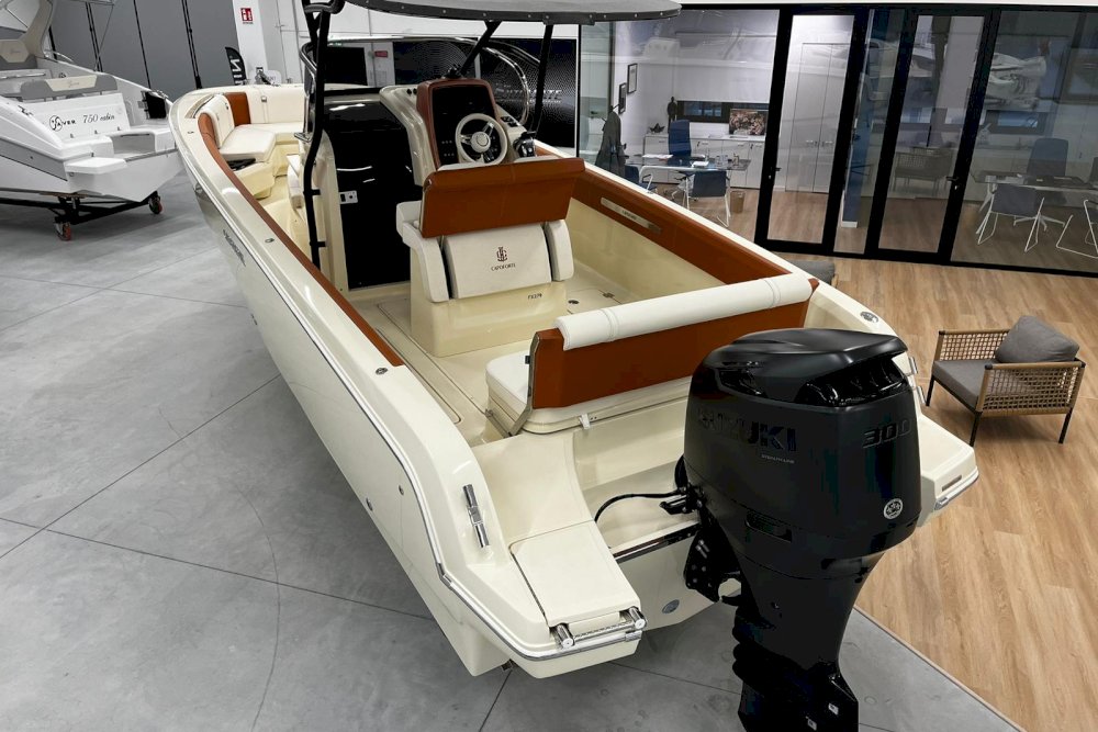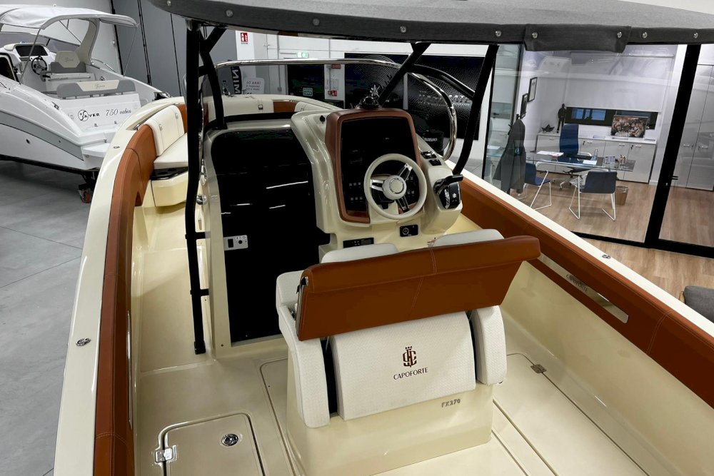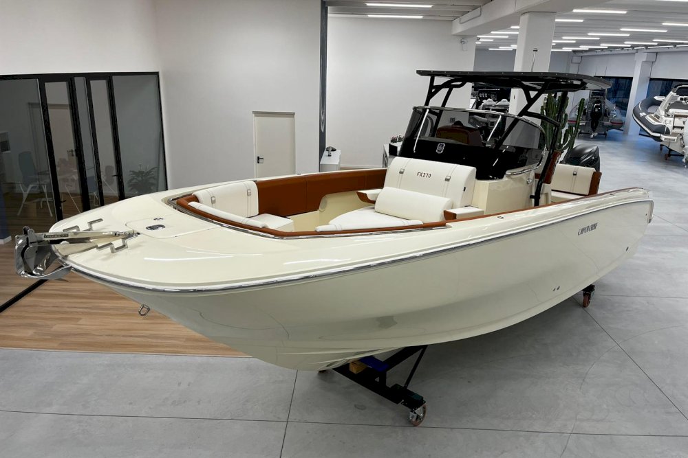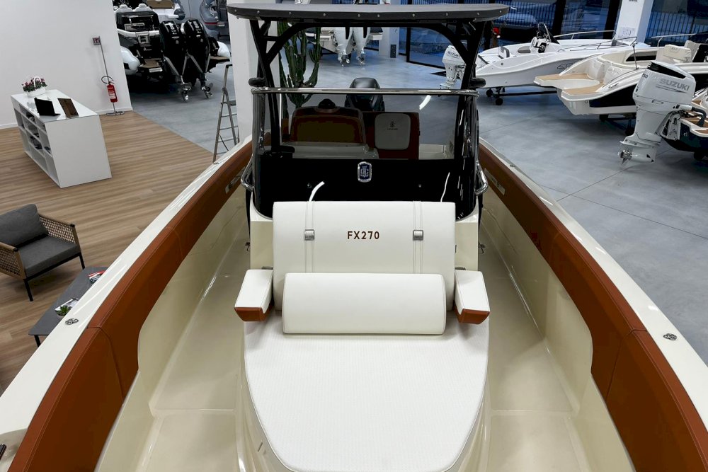 La prima nata della serie FX è pensata per i diportisti sportivi. È dotata di motori fuoribordo e la sua carena è studiata per offrire grandi prestazioni in totale sicurezza, anche con mare mosso. È una barca che sposa l’azione con il lusso, grazie a raffinate selezioni di colori, materiali e forme che creano un vero e proprio spazio di intrattenimento sul mare. Per questi motivi, FX270 propone sia una versione “Leisure” che una “Fishing”, grazie al suo deck ampio e versatile. La prua ospita un gavone sorprendentemente ampio, appositamente attrezzato per ospitare parabordi, attrezzature sportive e di sicurezza. L’open space, ideale per la pesca, può essere attrezzato con un divano aggiuntivo per creare una dinette. Il timone, alto e ben protetto, è integrato con la consolle e la struttura del parabrezza principale. Sottocoperta, uno spogliatoio con WC completa la dotazione di questa barca, pensata per chi cerca un compagno di avventura sportivo ed elegante.