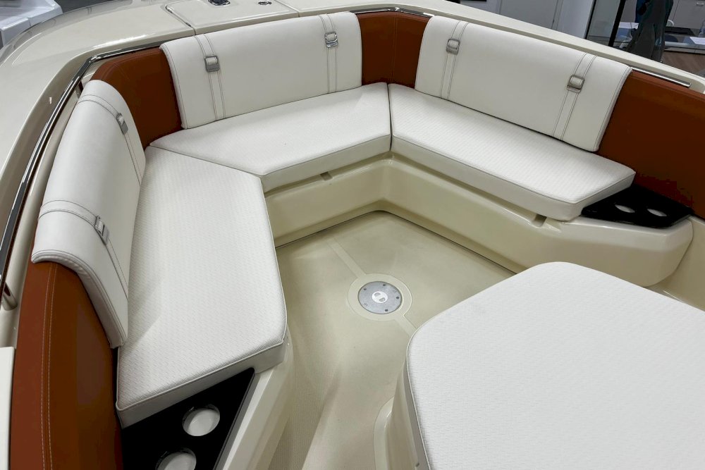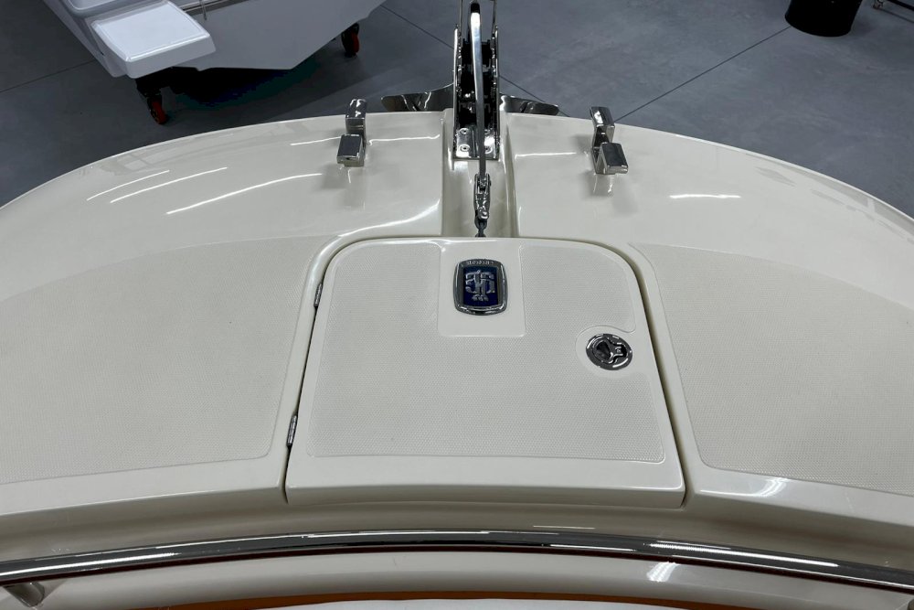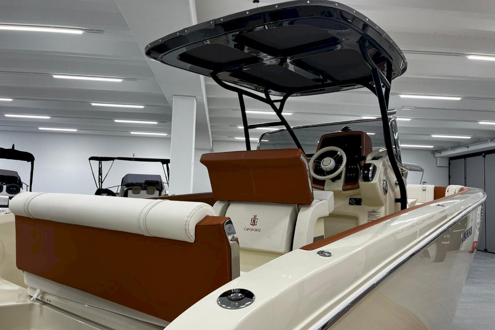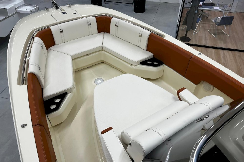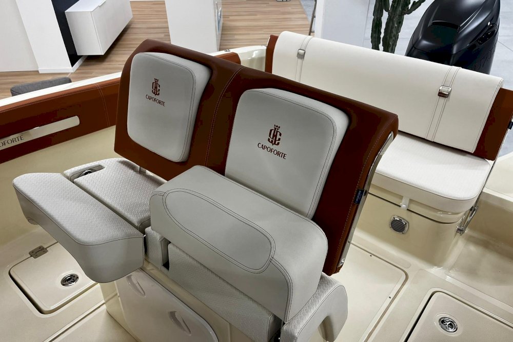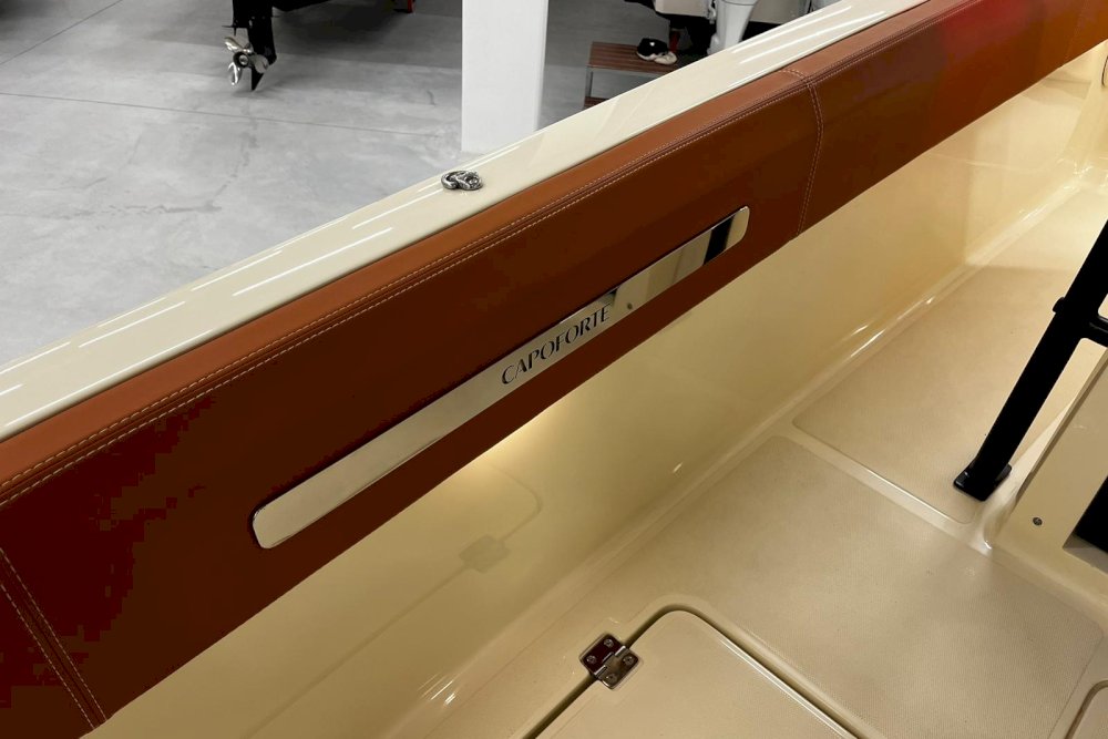 La prima nata della serie FX è pensata per i diportisti sportivi. È dotata di motori fuoribordo e la sua carena è studiata per offrire grandi prestazioni in totale sicurezza, anche con mare mosso. È una barca che sposa l’azione con il lusso, grazie a raffinate selezioni di colori, materiali e forme che creano un vero e proprio spazio di intrattenimento sul mare. Per questi motivi, FX270 propone sia una versione “Leisure” che una “Fishing”, grazie al suo deck ampio e versatile. La prua ospita un gavone sorprendentemente ampio, appositamente attrezzato per ospitare parabordi, attrezzature sportive e di sicurezza. L’open space, ideale per la pesca, può essere attrezzato con un divano aggiuntivo per creare una dinette. Il timone, alto e ben protetto, è integrato con la consolle e la struttura del parabrezza principale. Sottocoperta, uno spogliatoio con WC completa la dotazione di questa barca, pensata per chi cerca un compagno di avventura sportivo ed elegante.